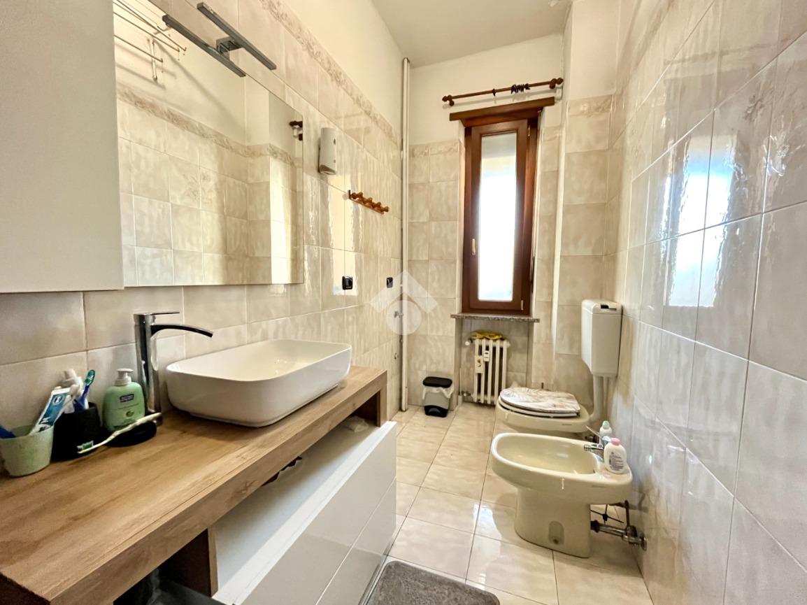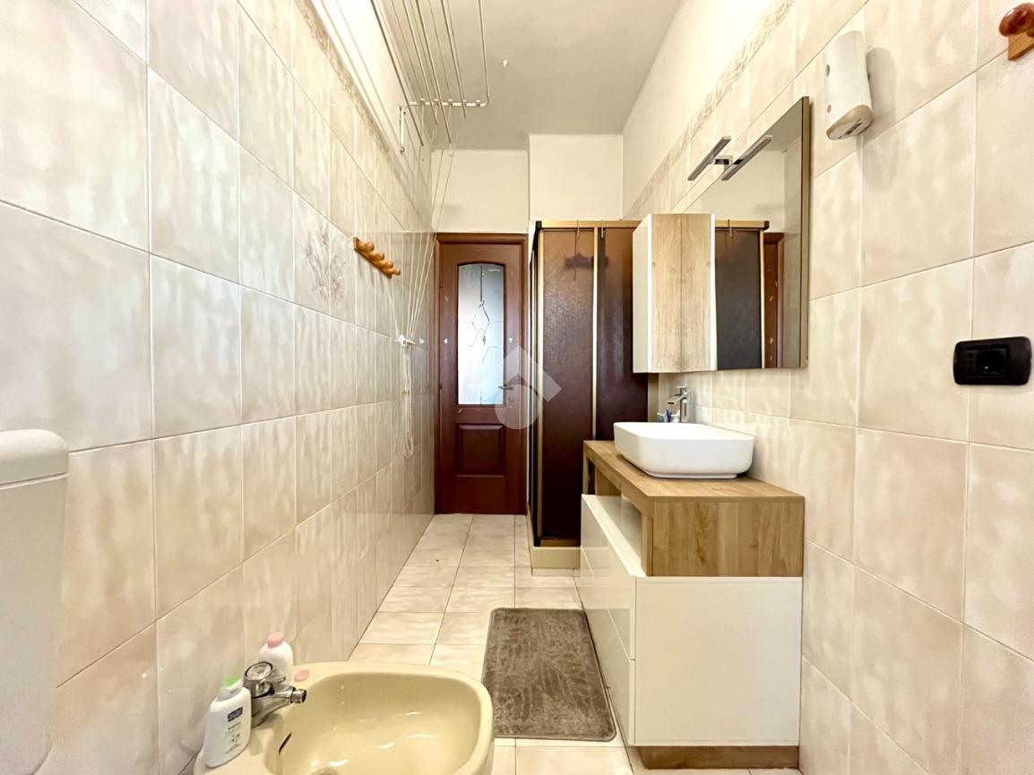 Il servizio è finestrato ed è presente il box doccia e l'attacco per la lavatrice, ed infine troviamo un pratico ripostiglio.
